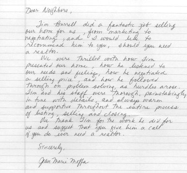 Jean Marie enjoyed her real estate experience so much that she sent a letter to her neighbors. When you find something great, you want to share it with your friends.